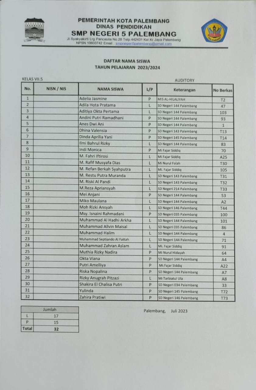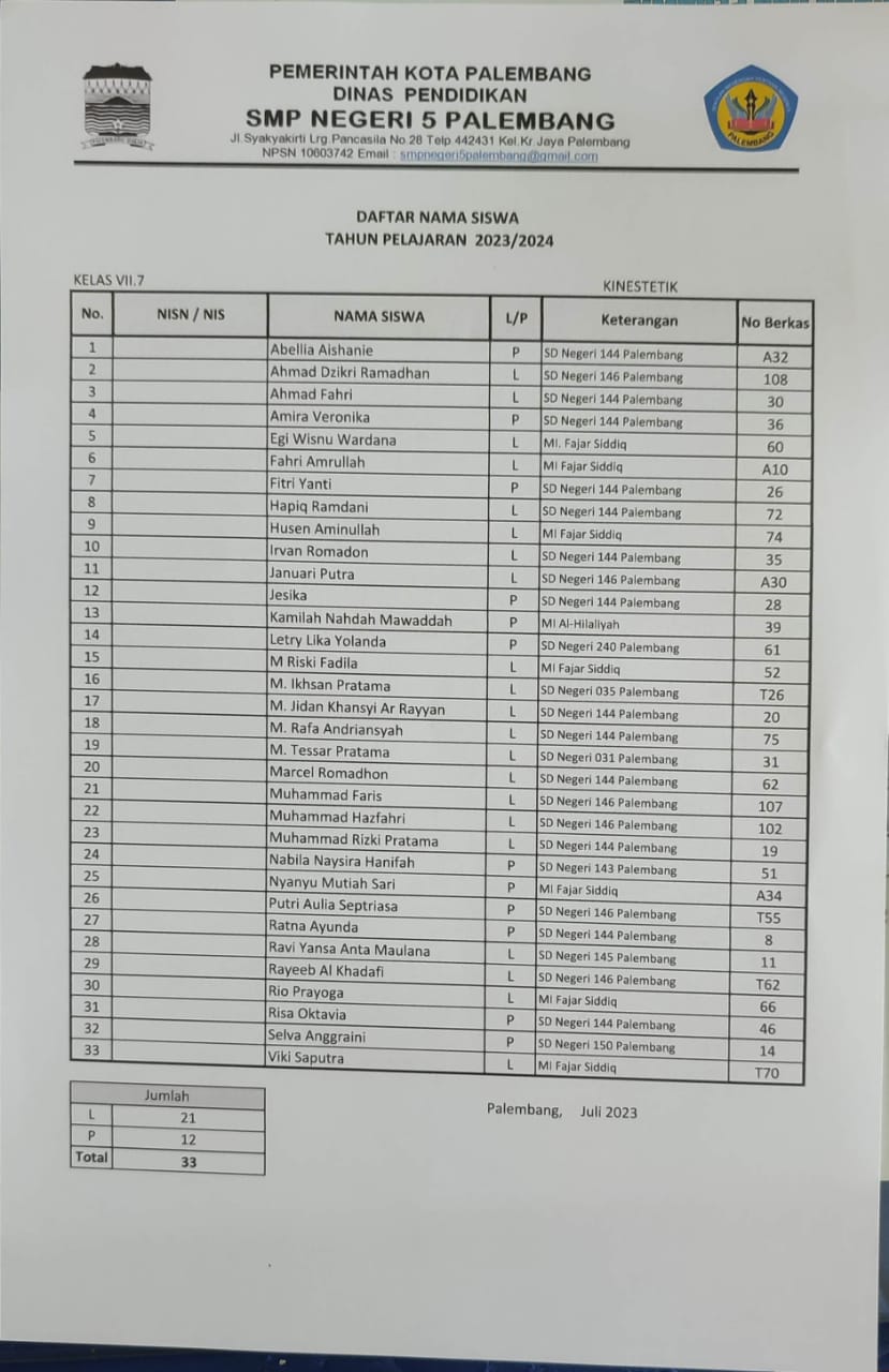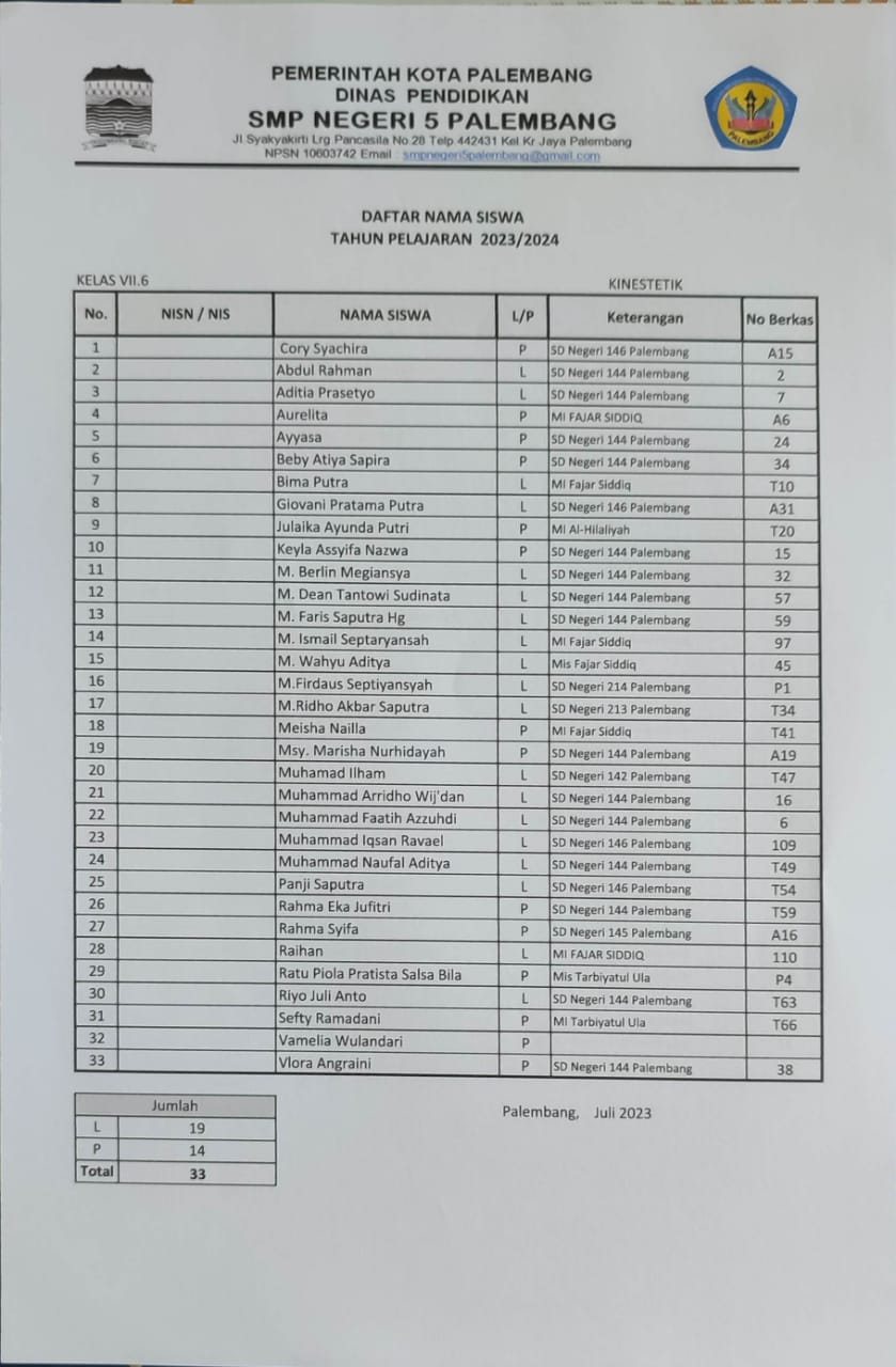 Berikut ini adalah pembagian kelas untuk peserta didik baru tahun pelajaran 2023/2024