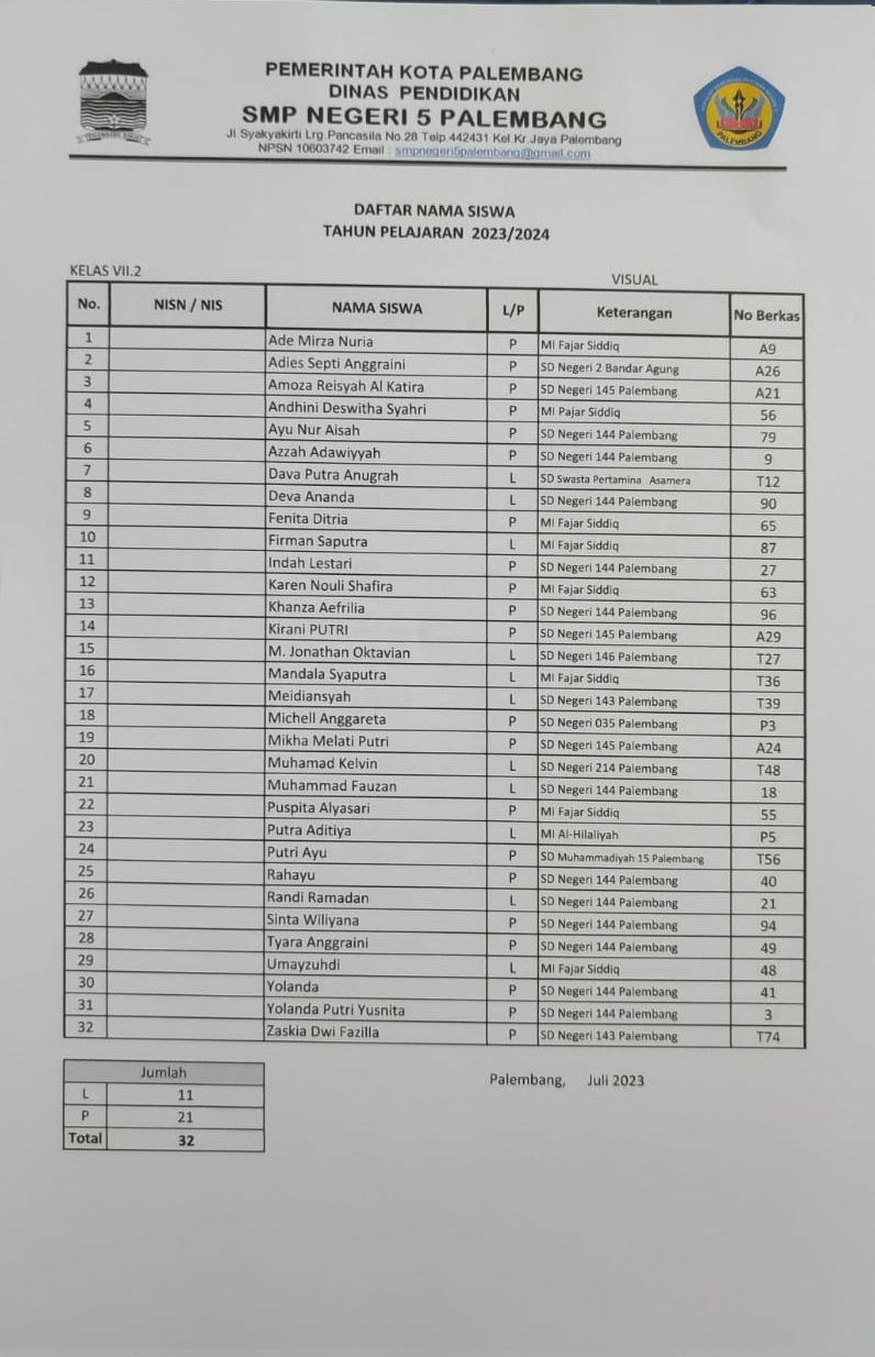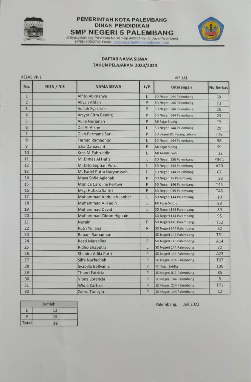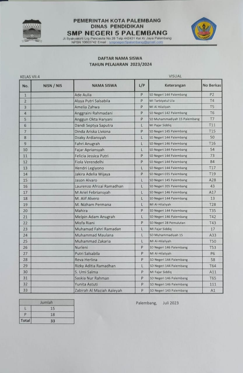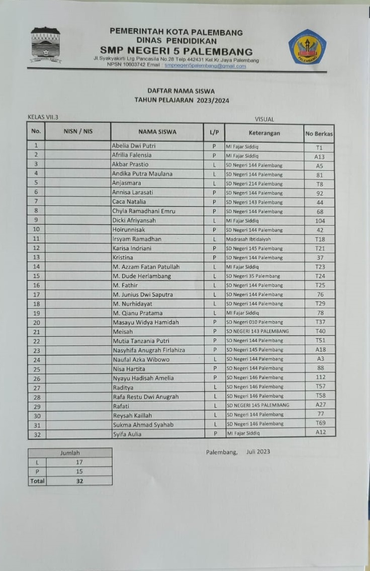 Berikut ini adalah pembagian kelas untuk peserta didik baru tahun pelajaran 2023/2024